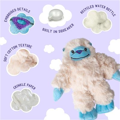 Your pet will enjoy hours of silly fun with the adorable Young Yeti! This cuddly creature has a soft, fluffy coat and bright blue feet to capture everyone's attention. What makes it even better? The toy is crafted from recycled water bottles, complete with squeaker and crinkle material for endless entertainment.
